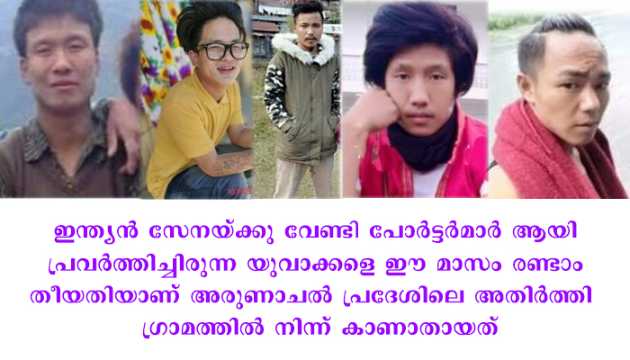 ഇന്ത്യൻ സേനയ്ക്കു വേണ്ടി പോർട്ടർമാർ ആയി പ്രവർത്തിച്ചിരുന്ന യുവാക്കളെ ഈ മാസം രണ്ടാം തീയതിയാണ് അരുണാചൽ പ്രദേശിലെ അതിർത്തി ഗ്രാമത്തിൽ നിന്ന് കാണാതായത്.