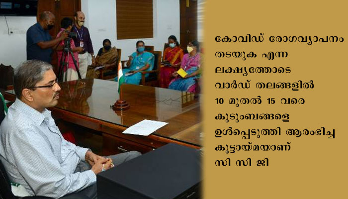 കോവിഡ് രോഗവ്യാപനം തടയുക എന്ന ലക്ഷ്യത്തോടെ വാര്‍ഡ് തലങ്ങളില്‍ 10 മുതല്‍ 15 വരെ  കുടുംബങ്ങളെ ഉള്‍പ്പെടുത്തി ആരംഭിച്ച കൂട്ടായ്മയാണ് സി സി ജി.  സി സി ജി യുടെ പ്രവര്‍ത്തനവും പുരോഗതിയും ആര്‍ ഡി ഒ ശിഖ സുരേന്ദ്രന്‍ ചീഫ് സെക്രട്ടറിയെ അറിയിച്ചു.