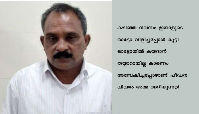 കുട്ടിയുടെ വീട്ടില് നിന്നും സ്ഥിരമായി യാത്രക്ക് ഇയാളുടെ ഓട്ടോയായിരുന്നു വിളിക്കാറുണ്ടായിരുന്നത്. കഴിഞ്ഞ ദിവസം വീണ്ടും ഇയാളുടെ ഓട്ടോ വിളിച്ചപ്പോള് കുട്ടി ഓട്ടോയില് കയറാന് തയ്യാറായില്ല കാരണം അന്വേഷിച്ചപ്പോഴാണ് പീഡന വിവരം അമ്മ അറിയുന്നത്.