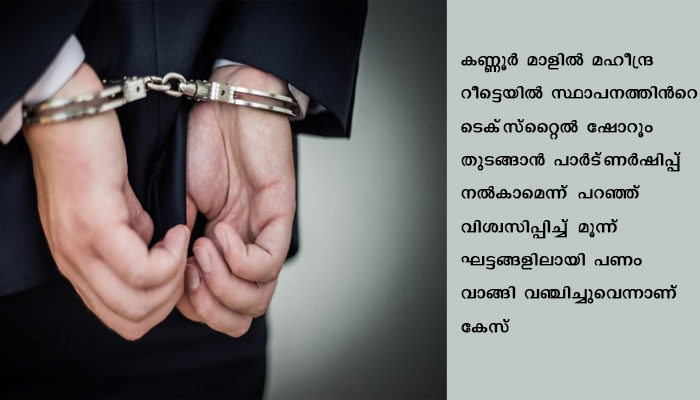 കണ്ണൂര് കണ്ണോത്തുംചാലില് താമസക്കാരനായ മാതമംഗലം സ്വദേശി കളരിക്കണ്ടി ആരിഫാണ് പരാതിക്കാരന്. കണ്ണൂര് മാളില് മഹീന്ദ്ര റീട്ടെയില് സ്ഥാപനത്തിന്റെ ടെക്സ്റ്റൈല് ഷോറൂം തുടങ്ങാന് പാര്ട്ണര്ഷിപ്പ് നല്കാമെന്ന് പറഞ്ഞ് വിശ്വസിപ്പിച്ച് മൂന്ന് ഘട്ടങ്ങളിലായി പണം വാങ്ങി വഞ്ചിച്ചുവെന്നാണ് കേസ്.