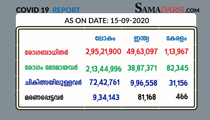 12 മരണങ്ങളാണ് ചൊവ്വാഴ്ച കോവിഡ്-19 മൂലമാണെന്ന് സ്ഥിരീകരിച്ചത്. സെപ്റ്റംബര് 5ന് മരണമടഞ്ഞ തൃശൂര് വെണ്മനാട് സ്വദേശി മുഹമ്മദ് അലി ഹാജി (87), സെപ്റ്റംബര് 7ന് മരണമടഞ്ഞ മലപ്പുറം വളവന്നൂര് സ്വദേശി മാധവന് (63), സെപ്റ്റംബര് 8ന് മരണമടഞ്ഞ തിരുവനന്തപുരം പാറശാല സ്വദേശി ലീല (60), തിരുവനന്തപുരം സ്വദേശി ഹരീന്ദ്രന് (67), തിരുവനന്തപുരം ബീമാപ്പള്ളി സ്വദേശിനി ഷഹുനാതുമ്മ (64), തിരുവനന്തപുരം വിളപ്പില്ശാല സ്വദേശി നാരായണ പിള്ള (89), കോഴിക്കോട് പറമ്പില് സ്വദേശി രവീന്ദ്രന് (69), തൃശൂര് പാമ്പൂര് സ്വദേശി പോള്സണ് (53), തൃശൂര് വഴനി സ്വദേശി ചന്ദ്രന്നായര് (79), സെപ്റ്റംബര് 9ന് മരണമടഞ്ഞ തിരുവനന്തപുരം പൂവാര് സ്വദേശി സ്റ്റാന്ലി (54), എറണാകുളം കുന്നത്തേരി സ്വദേശി ഇസ്മയില് (55), ആഗസ്റ്റ് 6ന് മരണമടഞ്ഞ പാലക്കാട് അമ്പലപ്പാറ സ്വദേശി ഖാലിദ് (55) എന്നിവരാണ് മരണമടഞ്ഞത്. ഇതോടെ ആകെ മരണം 466 ആയി. ഇത് കൂടാതെ ഉണ്ടായ മരണങ്ങള് എന്ഐവി ആലപ്പുഴയിലെ പരിശോധനയ്ക്ക് ശേഷം സ്ഥിരീകരിക്കുന്നതാണ്.