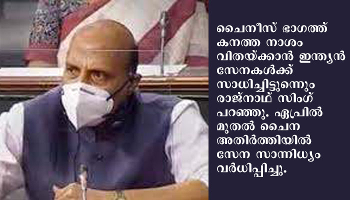 2020 ഏപ്രില് മാസം മുതല് ലഡാക്ക് അതിര്ത്തിയില് സൈന്യം സാന്നിധ്യം വര്ധിപ്പിച്ചു വരികയാണ്. ചൈനീസ് ഭാഗത്ത് കനത്ത നാശം വിതയ്ക്കാന് ഇന്ത്യന് സേനകള്ക്ക് സാധിച്ചിട്ടുണ്ടെന്നും രാജ്നാഥ് സിംഗ് പറഞ്ഞു. ഏപ്രില് മുതല് ചൈന അതിര്ത്തിയില് സേന സാന്നിധ്യം വര്ധിപ്പിച്ചു. മേയില് പാങ്ഗോംഗ്, ഗല്വാന്, ഗോഗ്ര എന്നിവിടങ്ങളില് നിയന്ത്രണരേഖ കടക്കാന് ചൈനീസ് സൈന്യം ശ്രമിച്ചു. ജൂണ് ആറിന് കമാന്ഡര്മാരുടെ യോഗത്തിലൂടെ പ്രശ്നം പരിഹരിക്കാന് ശ്രമിച്ചു. ജൂണ് പതിനഞ്ചിന് ചൈനീസ് സേന ആക്രമണത്തിലേക്ക് നീങ്ങി. ഇന്ത്യന് സൈന്യം ഈ നീക്കത്തെ കര്ശനമായി പ്രതിരോധിച്ചു. ചൈനീസ് ഭാഗത്ത് കാര്യമായ നാശനഷ്ടം ഉണ്ടാക്കുകയും ചെയ്തെന്നും മന്ത്രി പറഞ്ഞു. ഇക്കാര്യത്തില് ചര്ച്ച ആവശ്യപ്പെട്ട് കോണ്ഗ്രസ് അടക്കമുള്ള പ്രതിപക്ഷസംഘടനകള് ബഹളം വച്ചെങ്കിലും ഈ ഘട്ടത്തില് സഭ സേനകള്ക്കൊപ്പം നില്ക്കണമെന്നും അതിനാല് പ്രതിരോധമന്ത്രിയുടെ പ്രസ്താവനയില് ചര്ച്ച വേണ്ടെന്നുമുള്ള നിലപാടാണ് ലോക്സഭാ സ്പീക്കര് സ്വീകരിച്ചത്.