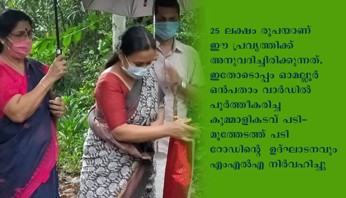 25 ലക്ഷം രൂപയാണ് ഈ പ്രവൃത്തിക്ക് അനുവദിച്ചിരിക്കുന്നത്. ഇതോടൊപ്പം ഓമല്ലൂര് ഒന്പതാം വാര്ഡില് പൂര്ത്തീകരിച്ച കുമ്മാളികടവ് പടി-മൂത്തേടത്ത് പടി റോഡിന്റെ ഉദ്ഘാടനവും എംഎല്എ നിര്വഹിച്ചു. മുഖ്യമന്ത്രിയുടെ തദ്ദേശ റോഡ് പുനരുദ്ധാരണ പദ്ധതിയില് 13 ലക്ഷം രൂപയും എംഎല്എ ആസ്തി വികസന ഫണ്ടില് 12 ലക്ഷം രൂപയുമാണ് ഈ റോഡിന് വകയിരുത്തിയിരിക്കുന്നത്. എംഎല്എയോടാപ്പം ഓമല്ലൂര് പഞ്ചായത്ത് പ്രസിഡന്റ് ഗീതാ വിജയന്, ഇലന്തൂര് ബ്ലോക്ക് പഞ്ചായത്ത് ക്ഷേമകാര്യ സ്റ്റാന്ഡിംഗ് കമ്മിറ്റി ചെയര്പേഴ്സണ് ജെ. ഇന്ദിര ദേവി, പഞ്ചായത്ത് മെമ്പര്മാരായ വി.ജി ശ്രീവിദ്യ, സി.കെ ഷൈനു, ശാരദാ കുമാരി, പഞ്ചായത്ത് അസി.എന്ജിനീയര് സി.കെ ഉഷ, ഓമല്ലൂര് സിപിഎം ലോക്കല് സെക്രട്ടറി കെ. ബാലകൃഷ്ണന് നായര് എന്നിവര് പങ്കെടുത്തു.