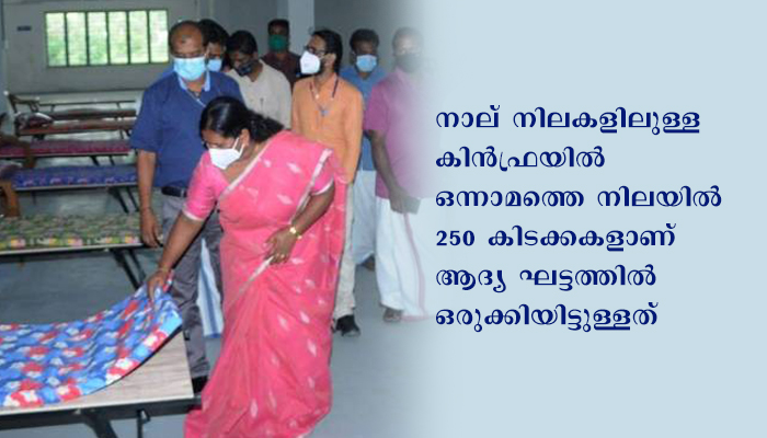 നാല് നിലകളിലുള്ള കിന്ഫ്രയിൽ ഒന്നാമത്തെ നിലയില് 250 കിടക്കകളാണ് ആദ്യ ഘട്ടത്തില് ഒരുക്കിയിട്ടുള്ളത്. ഇതില് 100 കിടക്കകള് സ്ത്രീകള്ക്കായി പ്രത്യേകം ക്യാബിന് സജ്ജീകരിച്ച് തയ്യാറാക്കിയതായി നോഡല് ഓഫീസര് ഡോ. മേരി ജ്യോതി അറിയിച്ചു. ആദ്യഘട്ടത്തില് 34 ടോയ്ലറ്റുകളും സജ്ജീകരിച്ചിട്ടുണ്ട്. ഗ്രൗണ്ട് ഫ്ളോറില് ആരോഗ്യ പ്രവര്ത്തകര്ക്കുള്ള സൗകര്യങ്ങളും ഒരുക്കിയിട്ടുണ്ട്. കിന്ഫ്രയുടെ രണ്ട്, മൂന്ന് നിലകളിലായി കൂടുതല് കിടക്കകള് തയ്യാറാക്കുന്നതായും നോഡല് ഓഫീസര് അറിയിച്ചു. നാല് ഡോക്ടര്മാര്, എട്ട് നഴ്സുമാര്, ശുചീകരണ തൊഴിലാളികള് തുടങ്ങിയവരെ നിലവില് നിയമിച്ചിട്ടുണ്ട്. സൗണ്ട് സിസ്റ്റം, ഇന്റര്നെറ്റ്, ടെലിവിഷനുകള്, മാലിന്യ സംസ്ക്കരണത്തിനായി ഇന്സിനെറ്റര് തുടങ്ങിയ സൗകര്യങ്ങള് ജില്ലാ പഞ്ചായത്തിന്റെ ആഭിമുഖ്യത്തില് ഇവിടെ ഒരുക്കിയിട്ടുണ്ട്.