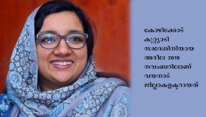 34 കാരിയായ അദീല അബ്ദുള്ള 2012 ബാച്ച് ഐ എ എസ് ഉദ്യോഗസ്ഥയാണ്. കോഴിക്കോട് കുറ്റ്യാടി സ്വദേശിനിയായ അദീല 2019 നവംബറിലാണ് വയനാട് ജില്ലാകളക്ടറായത്. മലബാറില് നിന്ന് സിവില് സര്വീസ് പരീക്ഷ പാസാകുന്ന ആദ്യ മുസ്ലിം വനിത എന്ന ചരിത്രബഹുമതി നേടിയ വ്യക്തിയാണ് അദീല അബ്ദുള്ള.