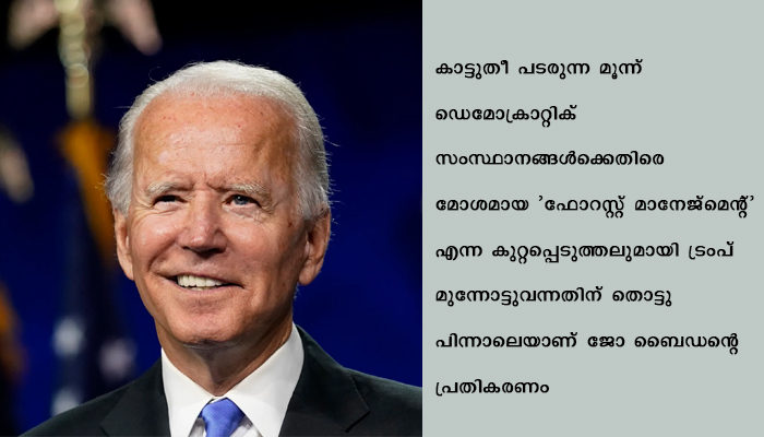കാട്ടുതീ പടരുന്ന മൂന്ന് ഡെമോക്രാറ്റിക് സംസ്ഥാനങ്ങൾക്കെതിരെ മോശമായ ‘ഫോറസ്റ്റ് മാനേജ്മെൻ്റ്’ എന്ന കുറ്റപ്പെടുത്തലുമായി ട്രംപ് മുന്നോട്ടുവന്നതിന് തൊട്ടു പിന്നാലെയാണ് ജോ ബൈഡൻ്റെ പ്രതികരണം.