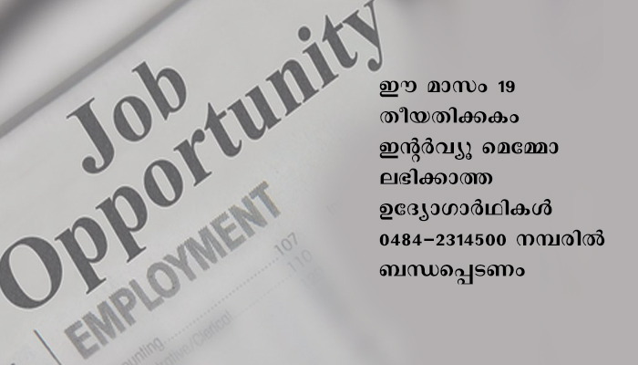കൊച്ചി ഇന്ഷുറന്സ് മെഡിക്കല് സര്വ്വീസ്/ഇന്ത്യന് സിസ്റ്റം ഓഫ് മെഡിസിന് ആയുര്വേദ കോളേജ് എന്നീ വകുപ്പുകളിലേക്ക് ഫാര്മസിസ്റ്റ് ഇന്റര്വ്യൂ 23-ന്