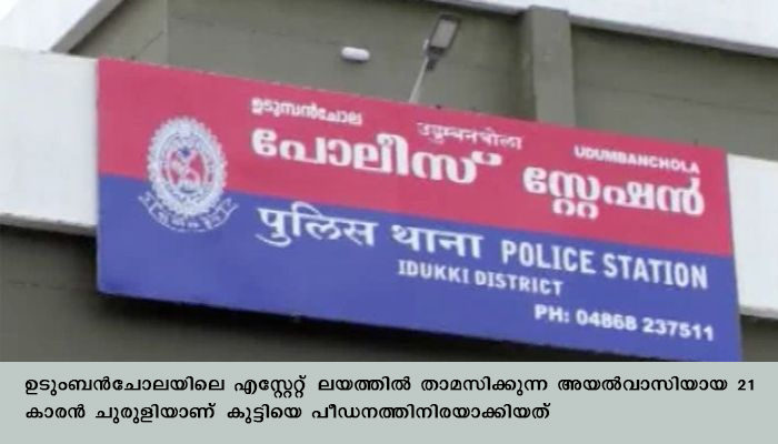 ഉടുംബന്ചോലയിലെ എസ്റ്റേറ്റ് ലയത്തില് താമസിക്കുന്ന അയല്വാസിയായ 21 കാരന് ചുരുളിയാണ് കുട്ടിയെ പീഡനത്തിനിരയാക്കിയത്. മാതാപിതാക്കള് തോട്ടത്തില് ജോലിക്കുപോയ സന്ദര്ഭത്തില് കുട്ടിയെ തന്റെ ലയത്തിലേക്ക് കൂട്ടികൊണ്ടുപോയി പീഡിപ്പിക്കുകയായിരുന്നു.