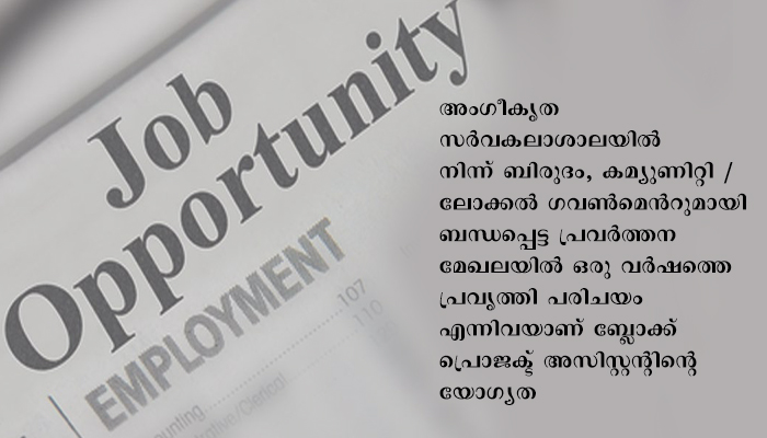 അംഗീകൃത സർവകലാശാലയിൽ നിന്ന് ബിരുദം, കമ്യുണിറ്റി / ലോക്കൽ ഗവൺമെൻറുമായി ബന്ധപ്പെട്ട പ്രവർത്തന മേഖലയിൽ ഒരു വർഷത്തെ പ്രവൃത്തി പരിചയം എന്നിവയാണ് ബ്ലോക്ക് പ്രൊജക്ട് അസിസ്റ്റൻ്റിൻ്റെ യോഗ്യത. പ്രായപരിധി 20- 35.