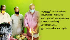 പത്തനംതിട്ട: കുന്നന്താനം പഞ്ചായത്തില് കുടുംബശ്രീയുടെ നേതൃത്വത്തില് ആരംഭിച്ച ജനകീയ ഹോട്ടല് ആഞ്ഞിലിത്താനത്ത് മാത്യു ടി. തോമസ് എം.എല്.എ. ഉദ്ഘാടനം ചെയ്തു. മല്ലപ്പള്ളി താലൂക്കിലെ ആദ്യത്തെ ജനകീയ ഹോട്ടലാണ് കുന്നന്താനം പഞ്ചായത്തിന്റെ കീഴിലാരംഭിച്ച ഈ ജനകീയ ഹോട്ടല്. പതിനൊന്നാം വാര്ഡിലെ കുടുംബശ്രീ പ്രവര്ത്തകരാണ് ജനകീയ ഹോട്ടല് പ്രാവര്ത്തികമാക്കിയത്. ജില്ലാ പഞ്ചായത്ത് അംഗം എസ്. വി. സുബിന്, പഞ്ചായത്ത് പ്രസിഡന്റ് രാധാകൃഷ്ണക്കുറുപ്പ് തുടങ്ങിയവര് പങ്കെടുത്തു.