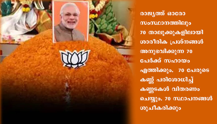 ന്യൂഡൽഹി: 17-09-2020 വ്യാഴാഴ്ച നരേന്ദ്രമോദിയുടെ എഴുപതാം ജന്മദിനമാണ്. സേവനവാരമായി ജന്മദിനം ആഘോഷിക്കാൻ ആണ് ബിജെപി തീരുമാനമെടുത്തിരിക്കുന്നത്. ഗുജറാത്തിൽ 247 കുടിവെള്ള പദ്ധതി അടക്കം നിരവധി പദ്ധതികൾക്ക് തുടക്കമിട്ടു. രാജ്യത്ത് ഓരോ സംസ്ഥാനത്തിലും 70 താലൂക്കുകളിലായി ശാരീരിക പ്രശ്നങ്ങൾ അനുഭവിക്കുന്ന 70 പേർക്ക് സഹായം എത്തിക്കും. 70 പേരുടെ കണ്ണ് പരിശോധിച്ച് കണ്ണടകൾ വിതരണം ചെയ്യും. 70 സ്ഥാപനങ്ങൾ ശുചീകരിക്കും. സൂറത്തിൽ എഴുപതിനായിരം വൃക്ഷത്തൈകൾ നടും. കോവിഡ് രോഗികൾക്കുള്ള മരുന്ന് വിതരണം, രക്തദാനം എന്നിവയും സംഘടിപ്പിക്കും.