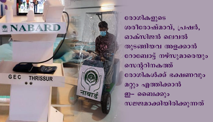 വളരെ കുറഞ്ഞ സമയത്ത് ഒറ്റതവണ 250 രോഗികള്ക്ക് ഭക്ഷണവും മറ്റും എത്തിക്കാന് ഇലക്ട്രിക് ബൈക്ക് സഹായിക്കുന്നു. ഒറ്റത്തവണ 100 കിലോ ഭാരം വരെ ഈ ബൈക്കിന് വഹിക്കാന് കഴിയും. അന്തരീക്ഷ മലിനീകരണവും ശബ്ദമലിനീകരണവും ഇല്ല എന്നതും ഇലക്ട്രോണിക് ബൈക്കിന്റെ പ്രത്യേകതകളാണ്. കോവിഡ് സെന്ററില് പ്രത്യേകം തയ്യാറാക്കിയ സോഫ്റ്റ്വെയര് ഉപയോഗപ്പെടുത്തിയാണ് കണ്ട്രോള് സെന്ററും നഴ്സിങ് സ്റ്റേഷനുകളും തമ്മിലുള്ള ആശയവിനിമയം സാധ്യമാക്കുന്നത്. തൃശൂര് ഗവണ്മെന്റ് എന്ജിനീറിങ് കോളേജാണ് നബാര്ഡിന്റെ സാമ്പത്തികസഹായത്തോടെ ഇവയ്ക്ക് രൂപം നല്കിയിരിക്കുന്നത്. ആരോഗ്യകേരളം ഡി പി എം ഡോ സതീശന് ടി വിയുടെ നേതൃത്വത്തില് കമ്പ്യൂട്ടര് സയന്സ് വിഭാഗം അസിസ്റ്റന്റ് പ്രൊഫസര് ഡോ അജയ് ജയിംസും വിദ്യാര്ത്ഥികളായ സൗരവ് പി എസ്, അശ്വിന് കുമാര് കെ, ടോണി സി എബ്രഹാം, അജയ് അരവിന്ദ്, സിദ്ധാര്ഥ് വി, മുഹമ്മദ് ഹാരിസ്, എവിന് വില്സണ്, ഗ്ലിന്സ്