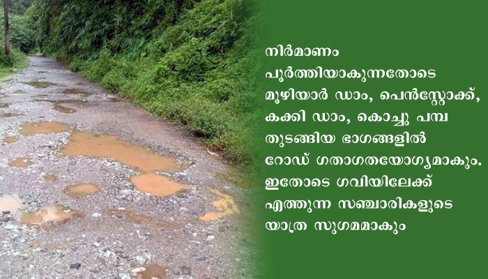 ശബരിമല തീര്ഥാടകരും ഈ പാത ഉപയോഗിക്കുന്നുണ്ട്. റോഡിന്റെ ശോച്യാവസ്ഥ മൂലം ഗവിയിലേക്കുള്ള സഞ്ചാരികളുടെ വരവില് കുറവുണ്ടായിരുന്നു. റോഡ് നവീകരണം പൂര്ത്തിയാകുന്നതോടെ ഗവി നിവാസികള് ഉള്പ്പടെയുള്ള മലയോര ജനങ്ങളുടെ യാത്രാ പ്രശ്നത്തിന് പരിഹാരമാകും. നിര്മാണം പൂര്ത്തിയാകുന്നതോടെ മൂഴിയാര് ഡാം, പെന്സ്റ്റോക്ക്, കക്കി ഡാം, കൊച്ചു പമ്പ തുടങ്ങിയ ഭാഗങ്ങളില് റോഡ് ഗതാഗതയോഗ്യമാകും. ഇതോടെ ഗവിയിലേക്ക് എത്തുന്ന സഞ്ചാരികളുടെ യാത്ര സുഗമമാകും.