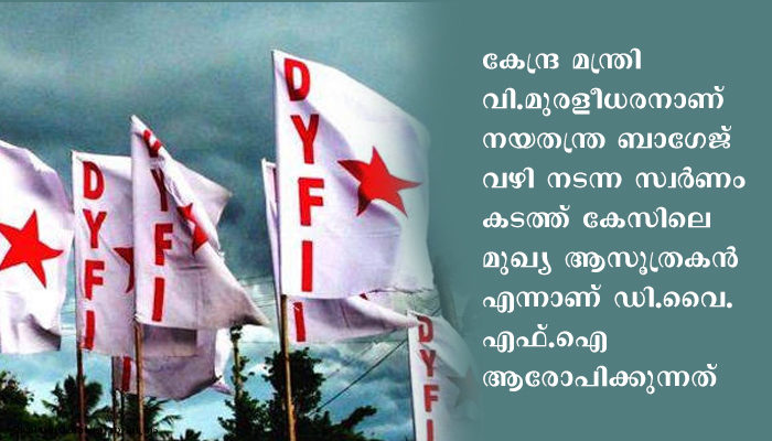 കേന്ദ്ര മന്ത്രി വി.മുരളീധരനാണ് നയതന്ത്ര ബാഗേജ് വഴി നടന്ന സ്വര്ണം കടത്ത് കേസിലെ മുഖ്യ ആസൂത്രകന് എന്നാണ് ഡി.വൈ.എഫ്.ഐ ആരോപിക്കുന്നത്. ഇക്കാര്യത്തില് സുതാര്യവും നിഷ്പക്ഷമായ അന്വേഷണം നടക്കണമെന്നും ഡി.വൈ.എഫ്.ഐ ആവശ്യപ്പെട്ടു.