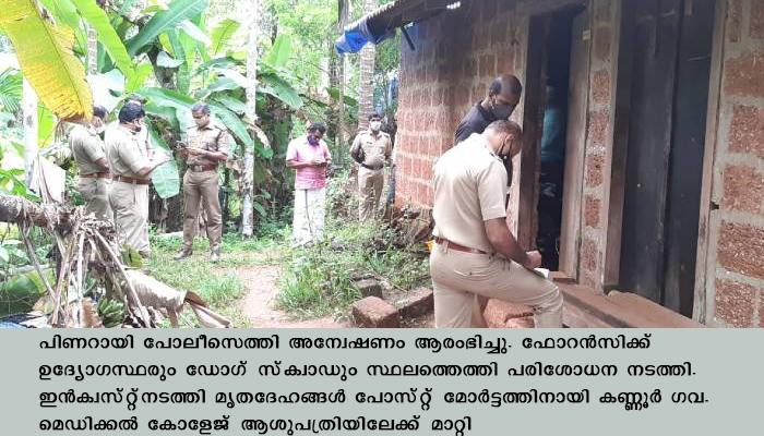 പിണറായി പോലീസെത്തി അന്വേഷണം ആരംഭിച്ചു. ഫോറന്സിക്ക് ഉദ്യോഗസ്ഥരും ഡോഗ് സ്ക്വാഡും സ്ഥലത്തെത്തി പരിശോധന നടത്തി. ഇന്ക്വസ്റ്റ്നടത്തി മൃതദേഹങ്ങള് പോസ്റ്റ് മോര്ട്ടത്തിനായി കണ്ണൂര് ഗവ.മെഡിക്കല് കോളേജ് ആശുപത്രിയിലേക്ക് മാറ്റി.
