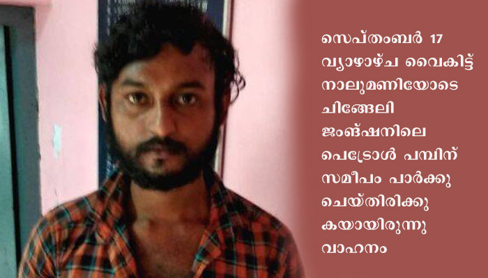സെപ്തംബര് 17 വ്യാഴാ ഴ്ച വൈകിട്ട് നാലുമണിയോടെ ചിങ്ങേലി ജംങ്ഷനിലെ പെട്രോള് പമ്പിന് സമീപം പാര്ക്കുചെയ്തിരിക്കുകയായിരുന്നു വാഹനം. കടയ്ക്കല് സിഐ രാജേഷിന്റെ നേതൃത്വത്തിലുളള പോലീസ് സംഘമാണ് പ്രതിയെ പിടിച്ചത്.