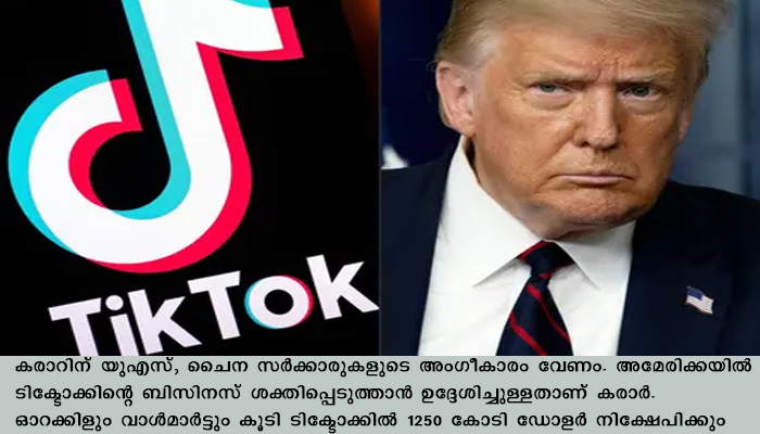 കരാറിന് യുഎസ്, ചൈന സര്ക്കാരുകളുടെ അംഗീകാരം വേണം. അമേരിക്കയില് ടിക്ടോക്കിന്റെ ബിസിനസ് ശക്തിപ്പെടുത്താന് ഉദ്ദേശിച്ചുള്ളതാണ് കരാര്. ഓറക്കിളും വാള്മാര്ട്ടും കൂടി ടിക്ടോക്കില് 1250 കോടി ഡോളര് നിക്ഷേപിക്കും.