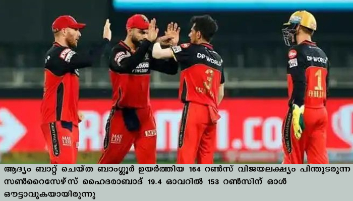 ആദ്യം ബാറ്റ് ചെയ്ത ബാംഗ്ലൂര് ഉയര്ത്തിയ 164 റണ്സ് വിജയലക്ഷ്യം പിന്തുടരുന്ന സണ്റൈസേഴ്സ് ഹൈദരാബാദ് 19.4 ഓവറില് 153 റണ്സിന് ഓള്ഔട്ടാവുകയായിരുന്നു.