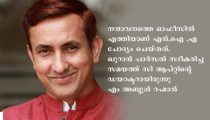 തിരുവനന്തപുരം: യു.എ.ഇ യിൽ നിന്നും എത്തിയ ഖുറാൻ വിതരണവുമായി ബന്ധപ്പെട്ട് എൽ.ബി.എസ് ഡയറക്ടർ എം .അബ്ദുൾ റഹ്മാനെ ദേശീയ അന്വേഷണ ഏജൻസി ചോദ്യം ചെയ്തു. നന്ദാവനത്തെ ഓഫീസിൽ എത്തിയാണ് എൻ.ഐ .എ ചോദ്യം ചെയ്തത്. ഖുറാൻ പാർസൽ സ്വീകരിച്ച സമയത്ത് സി ആപ്റ്റിൻ്റെ ഡയറക്ടറായിരുന്നു എം അബ്ദുൾ റഹ്മാൻ. സി ആപ്റ്റിൻ്റെ തിരുവനന്തപുരത്തെ ഗോഡൗണിലും എൻ ഐ എ പരിശോധന നടത്തിയിട്ടുണ്ട്. ഖുറാൻ പാഴ്സൽ പൊട്ടിച്ചതുമായി ബന്ധപ്പെട്ട് ഉദ്യോഗസ്ഥർ വിവരങ്ങൾ ചോദിച്ചറിഞ്ഞു. സ്റ്റോക്ക് രജിസ്റ്ററും എൻ ഐ എ പരിശോധിച്ചു.