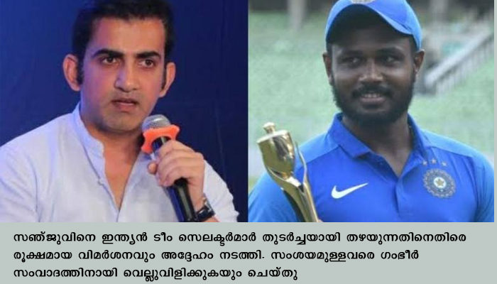 ഇന്ത്യയിലെ ഏറ്റവും മികച്ച യുവ ബാറ്റ്സ്മാനും യുവ വിക്കറ്റ് കീപ്പര് ബാറ്റ്സ്മാനുമാണ് മലയാളി താരം സഞ്ജു സാംസണെന്ന് ഗംഭീർ അഭിപ്രായപ്പെട്ടു. സഞ്ജുവിനെ ഇന്ത്യന് ടീം സെലക്ടർമാർ തുടര്ച്ചയായി തഴയുന്നതിനെതിരെ രൂക്ഷമായ വിമർശനവും അദ്ദേഹം നടത്തി. സംശയമുള്ളവരെ ഗംഭീര് സംവാദത്തിനായി വെല്ലുവിളിക്കുകയും ചെയ്തു.