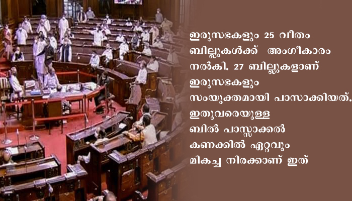 വർഷകാല സമ്മേളനത്തിൽ ലോക്സഭയിൽ പതിനാറും, രാജ്യസഭയിൽ ആറും (ആകെ 22) ബില്ലുകൾ അവതരിപ്പിക്കപ്പെട്ടതായി കേന്ദ്രമന്ത്രി അറിയിച്ചു. ഇരുസഭകളും 25 വീതം ബില്ലുകൾക്ക് അംഗീകാരം നൽകി. 27 ബില്ലുകളാണ് ഇരുസഭകളും സംയുക്തമായി പാസാക്കിയത്. ഇതുവരെയുള്ള ബില് പാസ്സാക്കല് കണക്കിൽ ഏറ്റവും മികച്ച നിരക്കാണ് ഇത്.