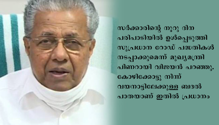 തിരുവനന്തപുരം: സർക്കാരിന്റെ നൂറു ദിന പരിപാടിയിൽ ഉൾപ്പെടുത്തി സുപ്രധാന റോഡ് പദ്ധതികൾ നടപ്പാക്കുമെന്ന് മുഖ്യമന്ത്രി പിണറായി വിജയൻ പറഞ്ഞു. കോഴിക്കോട്ടു നിന്ന് വയനാട്ടിലേക്കുള്ള ബദൽ പാതയാണ് ഇതിൽ പ്രധാനം. ഇപ്പോൾ കോഴിക്കോട്ടുനിന്ന് താമരശ്ശേരി ചുരം വഴിയാണ് വയനാട്ടിലേക്ക് വാഹനങ്ങൾ പോകുന്നത്. പ്രകൃതിക്ഷോഭവും വാഹനങ്ങളുടെ തിരക്കും കാരണം ഇതുവഴിയുള്ള യാത്ര ദുഷ്‌കരമായിരിക്കുകയാണ്. ഇതിനു പരിഹാരമായാണ് വയനാട്ടിലേക്ക് തുരങ്കപാത പണിയുന്നത്.