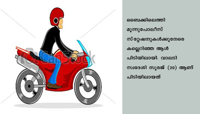 ചങ്ങനാശേരി: ബൈക്കിലെത്തി മൂന്നുപോലീസ് സ്റ്റേഷനുകള്ക്കുനേരെ കല്ലെറിഞ്ഞ ആള് പിടിയിലായി. വാലടി സ്വദേശി സൂരജ് (20) ആണ് പിടിയിലായത്. ഒപ്പമുണ്ടായിരുന്ന ശ്യാം എന്നയാളിനെ പിടികിട്ടിയട്ടില്ല .അയാള്ക്കായുളള തെരച്ചിലിലാണ് പോലീസ്. കഴിഞ്ഞ ദിവസം രാത്രി 11 ന് കറുകച്ചാല്, 11.30ന് ചങ്ങനാശേരി, 12 ന് കൈനടി എന്നീ പോലീസ് സ്റ്റേഷനുകള്ക്കുനേരെയാണ് ആക്രമണ മുണ്ടായത്. ബൈക്കിലെത്തിയ ഇവര് കല്ലെറിഞ്ഞിട്ട് പാഞ്ഞുപോകുകയായിരുന്നു.