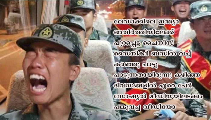 ലഡാക്കിലെ ഇന്ത്യാ അതിർത്തിയിലേക്ക് പുറപ്പെട്ട ചൈനീസ് സൈനികർ ബസിൽ വച്ച് കരഞ്ഞു പാട്ടു പാടുന്നതായിരുന്നു കഴിഞ്ഞ ദിവസങ്ങളിൽ ഏറെ പേർ സോഷ്യൽ മീഡിയയിലടക്കം പങ്കുവച്ച വീഡിയോ.