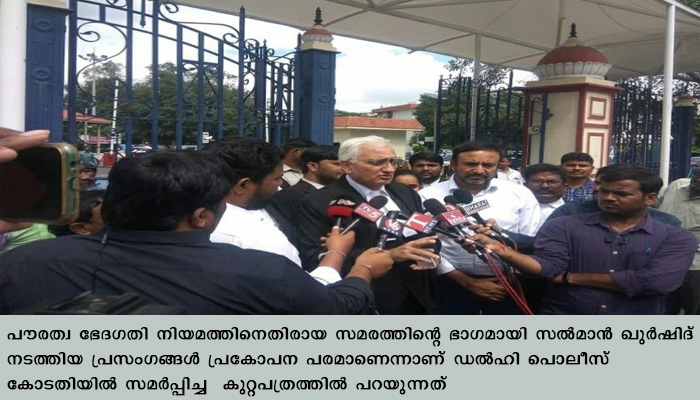 സമരപരിപാടിയിൽ പങ്കെടുത്ത് ഭരണഘടനയെ കുറിച്ചാണ് താൻ സംസാരിച്ചത് , അത് പ്രകോപനപരമാണ് എന്നാണ് ഡൽഹി പൊലീസിൻ്റെ വിചിത്രമായ കണ്ടെത്തലെന്ന് സൽമാൻ ഖുർഷിദ് മാധ്യമങ്ങളോട് പറഞ്ഞു.
