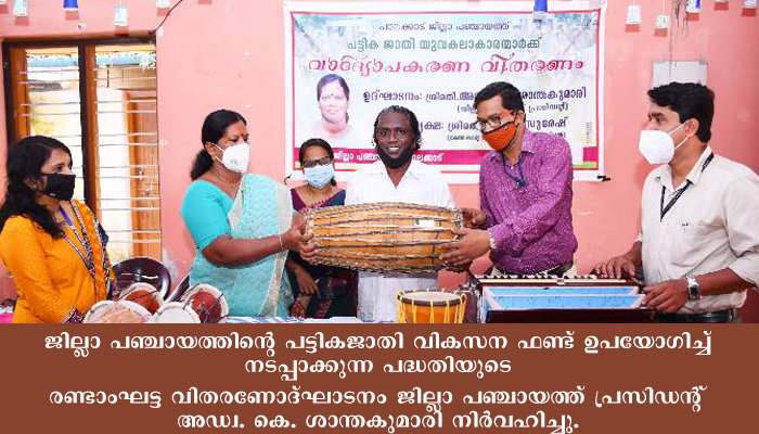 ജൈനിമേട് പോസ്റ്റ് മെട്രിക് ഹോസ്റ്റലില് നടന്ന പരിപാടിയില് ജില്ലാ പഞ്ചായത്ത് ക്ഷേമകാര്യ സ്റ്റാന്ഡിങ് കമ്മിറ്റി ചെയര്മാന് ബിന്ദു സുരേഷ് അധ്യക്ഷയായി. രണ്ടാം ഘട്ടത്തിന്റെ ഭാഗമായി 12 വാദ്യസംഘങ്ങള്ക്ക് ആവശ്യമായ വാദ്യോപകരണങ്ങളാണ് വിതരണം ചെയ്തത്. 6,63,000 രൂപയാണ് പദ്ധതിക്കായി ചെലവഴിച്ചത്. ജില്ലാ പട്ടികജാതി വികസന ഓഫീസര് എം. ജെ. അരവിന്ദാക്ഷന് സംസാരിച്ചു.