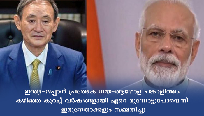 ഇന്ത്യ-ജപ്പാന് പ്രത്യേക നയ-ആഗോള പങ്കാളിത്തം കഴിഞ്ഞ കുറച്ച് വര്ഷങ്ങളായി ഏറെ മുന്നോട്ടുപോയെന്ന് ഇരുനേതാക്കളും സമ്മതിച്ചു. പരസ്പരം വിശ്വാസത്തെയും മൂല്യങ്ങളെയും അടിസ്ഥാനമാക്കി ഈ ബന്ധം കൂടുതല് ശക്തിപ്പെടുത്താനുള്ള ആഗ്രഹം പ്രകടിപ്പിക്കുകയും ചെയ്തു.