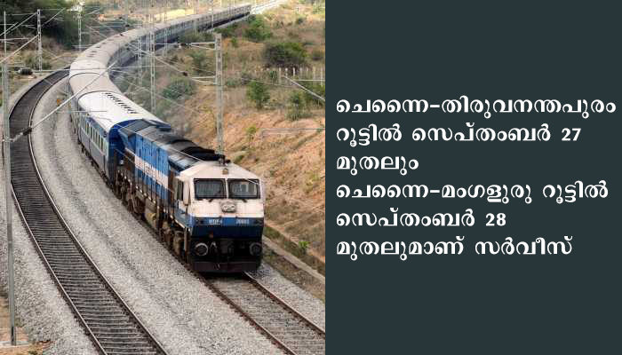 ചെന്നൈ-തിരുവനന്തപുരം റൂട്ടില് സെപ്തംബര് 27 മുതലും ചെന്നൈ-മംഗളുരു റൂട്ടില് സെപ്തംബര് 28 മുതലുമാണ് സര്വീസ്. ചെന്നൈ-തിരുവന്തപുരം ട്രെയിന് രാത്രി ഏഴേമുക്കാലിനും മംഗളുരു സ്പെഷ്യല് രാത്രി പതിനൊന്നിനുമാണ് ചെന്നൈ സെന്ട്രലില് നിന്ന് പുറപ്പെടുക.