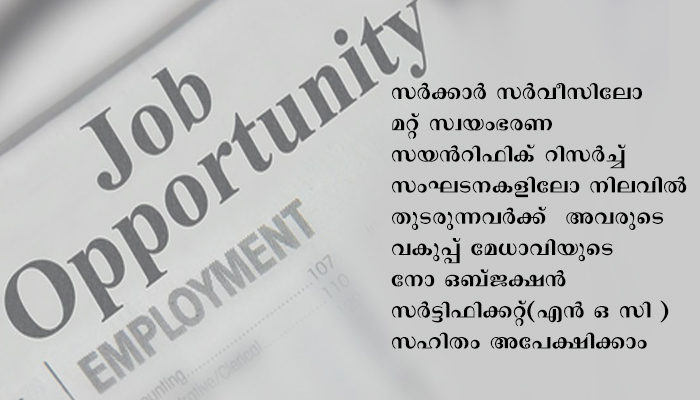 തൃശ്ശൂർ:കേരള സംസ്ഥാന മെഡിസിനൽ പ്ലാൻറ്സ് ബോർഡിന് കീഴിൽ വരുന്ന ആയുഷ് വകുപ്പിൽ സീനിയർ സയൻറിഫിക് ഓഫീസർ ഡെപ്യൂട്ടേഷൻ വ്യവസ്ഥയിൽ അപേക്ഷകൾ ക്ഷണിച്ചു. സർക്കാർ സർവീസിലോ മറ്റ് സ്വയംഭരണ സയൻറിഫിക് റിസർച്ച് സംഘടനകളിലോ നിലവിൽ തുടരുന്നവർക്ക് അവരുടെ വകുപ്പ് മേധാവിയുടെ നോ ഒബ്ജക്ഷൻ സർട്ടിഫിക്കറ്റ്(എൻ ഒ സി ) സഹിതം അപേക്ഷിക്കാം. അപേക്ഷിക്കേണ്ട അവസാന തീയതി 2020 സെപ്റ്റംബർ 31 ആണ്. ഏതെങ്കിലും അംഗീകൃത സർവകലാശാലയിൽ നിന്നുള്ള ബോട്ടണി എം എസ് സി ഫസ്റ്റ് ക്ലാസ് ബിരുദാനന്തര ബിരുദമോ, ആയുർവേദ മെഡിക്കൽ സയൻസ് ബാച്ചിലർ ഡിഗ്രിയോ ആണ് യോഗ്യത. അഗ്രികൾച്ചർ, ഫോറസ്ട്രി, തുടങ്ങിയ മേഖലകളിലുള്ള 10 വർഷത്തെ മുൻ പരിചയം അഭികാമ്യം. ശമ്പളപരിധി 40500- 85000. ഒരിക്കൽ അപേക്ഷിച്ചവർ വീണ്ടും അപേക്ഷിക്കേണ്ടതില്ല എന്ന് എസ് എം പി ബി കെ ചീഫ് എക്സിക്യൂട്ടീവ് ഓഫീസർ അറിയിച്ചു. കൂടുതൽ വിവരങ്ങൾക്ക് തൃശൂർ ഷൊർണൂർ റോഡിലുള്ള ആയുഷ് ഓഫീസുമായി ബന്ധപ്പെടാം. ഇ-മെയിൽ –www.smpbkerala.org. ഫോൺ-0487 2323151.