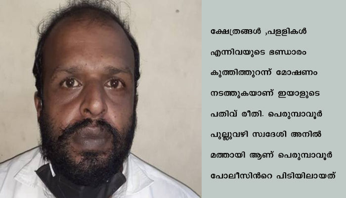 പെരുമ്പാവൂര്: സംസ്ഥാനത്തിന്റെ വിവിധ ഭാഗങ്ങളില് കറങ്ങി നടന്ന് മോഷണം നടത്തുന്നയാള് അറസ്റ്റിലായി. ക്ഷേത്രങ്ങള് ,പളളികള് എന്നിവയുടെ ഭണ്ഡാരം കുത്തിത്തുറന്ന് മോഷണം നടത്തുകയാണ് ഇയാളുടെ പതിവ് രീതി. പെരുമ്പാവൂര് പുല്ലുവഴി സ്വദേശി അനില് മത്തായി ആണ് പെരുമ്പാവൂര് പോലീസിന്റെ പിടിയിലായത്.