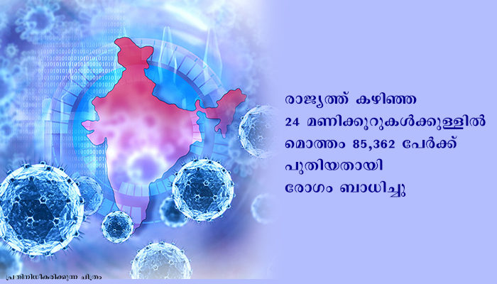 ന്യൂ ഡൽഹി: രാജ്യത്ത് കഴിഞ്ഞ 24 മണിക്കൂറുകള്ക്കുള്ളില് മൊത്തം 85,362 പേര്ക്ക് പുതിയതായി രോഗം ബാധിച്ചു. കേസുകളില് 75%വും 10 സംസ്ഥാനങ്ങള്/കേന്ദ്രഭരണപ്രദേശങ്ങളിലാണ് കേന്ദ്രീകരിച്ചിരിക്കുന്നത്.