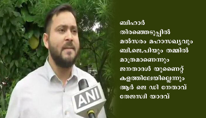 പാറ്റ്ന: ബിഹാർ തിരഞ്ഞെടുപ്പിൽ മൽസരം മഹാസഖ്യവും ബി.ജെ.പിയും തമ്മിൽ മാത്രമാണെന്നും ജനതാദൾ യുണൈറ്റ് കളത്തിലേയില്ലെന്നും ആർ ജെ ഡി നേതാവ് തേജസ്വി യാദവ്.