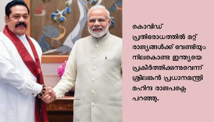 ശ്രീലങ്കയുമായുള്ള ബന്ധം തുടങ്ങിയതാണെന്ന് പ്രധാനമന്ത്രി നരേന്ദ്രമോദി. 26-9 -2020 ൽ നടന്ന ഇന്ത്യ-ശ്രീലങ്ക വെര്ച്ച്വല് ഉഭയകക്ഷി ചര്ച്ചയിലാണ് മോദിയുടെ പരാമര്ശം. ശ്രീലങ്കയുമായുള്ള സഹകരണത്തിന് ഇന്ത്യ വലിയ പ്രധാന്യം നല്കുന്നുണ്ടെന്നും മോദി പറഞ്ഞു. കൊവിഡ് പ്രതിരോധത്തില് മറ്റ് രാജ്യങ്ങള്ക്ക് വേണ്ടിയും നിലകൊണ്ട ഇന്ത്യയെ പ്രകീര്ത്തിക്കുന്നുവെന്ന് ശ്രീലങ്കന് പ്രധാനമന്ത്രി മഹിന്ദ രാജപക്സെ പറഞ്ഞു.