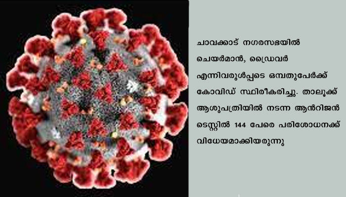 ചാവക്കാട്: ചാവക്കാട് നഗരസഭയില് ചെയര്മാന്,ഡ്രൈവര് എന്നിവരുള്പ്പടെ ഒമ്പതുപേര്ക്ക് കോവിഡ് സ്ഥിരീകരിച്ചു. താലൂക്ക് ആശുപത്രിയില് നടന്ന ആന്റിജന് ടെസ്റ്റില് 144 പേരെ പരിശോധനക്ക് വിധേയമാക്കിയരുന്നു. ഇതില് പത്ത് പേര്ക്ക് കോവിഡ് കണ്ടെത്തി.