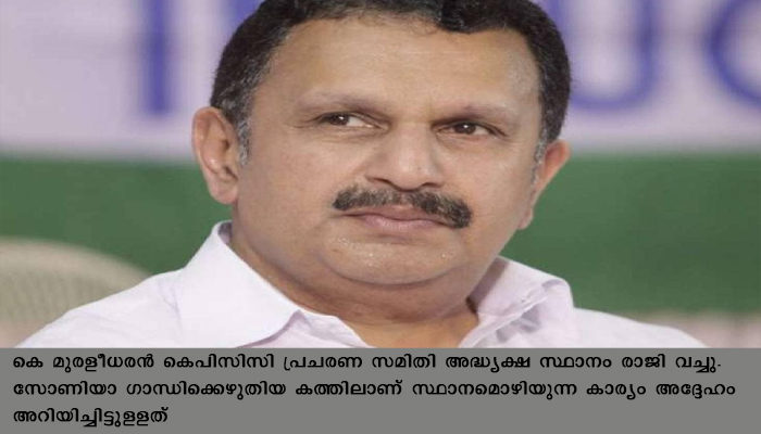 കെപിസിസി പ്രചരണ സമിതി അദ്ധ്യക്ഷസ്ഥാനം ഒഴിഞ്ഞ് കെ മുരളീധരന്‍