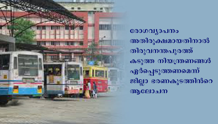 രോഗവ്യാപനം അതിരൂക്ഷമായതിനാൽ തിരുവനന്തപുരത്ത് കടുത്ത നിയന്ത്രണങ്ങൾ ഏർപ്പെടുത്തണമെന്ന് ജില്ലാ ഭരണകൂടത്തിന്റെ ആലോചന. രോഗവ്യാപനം നിയന്ത്രണവിധേയമാകും വരെ അവശ്യ സേവനങ്ങൾ മാത്രമായി ഒതുക്കണം. പൊതുഗതാഗതം അനുവദിക്കരുത്. സർക്കാർ സ്വകാര്യ സ്ഥാപനങ്ങളിൽ അമ്പത് ശതമാനം ജീവനക്കാർ മാത്രമേ അനുവദിക്കാവൂ തുടങ്ങിയ ശുപാർശകൾ മുന്നോട്ടു വെക്കുകയും ചെയ്തിട്ടുണ്ട്.