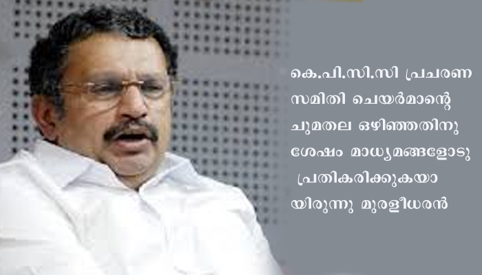 കെ.പി.സി.സി പ്രചരണ സമിതി ചെയർമാൻ്റെ ചുമതല ഒഴിഞ്ഞതിനു ശേഷം മാധ്യമങ്ങളോടു പ്രതികരിക്കുകയായിരുന്നു മുരളീധരൻ.