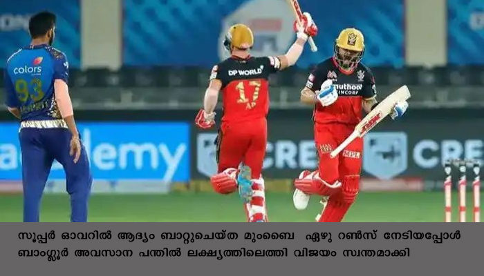 സൂപ്പര് ഓവറില് ആദ്യം ബാറ്റുചെയ്ത മുംബൈ ഏഴു റണ്സ് നേടിയപ്പോൾ ബാംഗ്ലൂര് അവസാന പന്തില് ലക്ഷ്യത്തിലെത്തി വിജയം സ്വന്തമാക്കി. ഡിവില്ലിയേഴ്സും കോഹ്ലിയുമാണ് ബാംഗ്ലൂരിനുവേണ്ടി സൂപ്പര് ഓവറില് ബാറ്റുചെയ്തത്. എന്നാല് പന്തെറിഞ്ഞ ബൂംറ അക്ഷരാര്ഥത്തില് മികച്ച പ്രകടനം നടത്തിയെങ്കിലും അവസാന പന്തില് ബൌണ്ടറിയടിച്ച് കോഹ്ലി ബാംഗ്ലൂരിനെ ലക്ഷ്യത്തിലെത്തിക്കുകയായിരുന്നു. ബാംഗ്ലൂരിനുവേണ്ടി സൂപ്പര് ഓവറില് പന്തെറിഞ്ഞ നവ്ദീപ് സെയ്നിയാണ് മത്സരത്തില് ഹീറോയായത്.