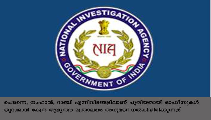 ന്യൂഡല്ഹി: രാജ്യത്ത് എന്ഐഎ മൂന്ന് ബ്രാഞ്ച് ഓഫീസുകള് കൂടി പ്രവര്ത്തനം ആരംഭിക്കുന്നു. ചെന്നൈ, ഇംഫാല്, റാഞ്ചി എന്നിവിടങ്ങളിലാണ് പുതിയതായി ഓഫീസുകള് തുറക്കാന് കേന്ദ്ര ആഭ്യന്തര മന്ത്രാലയം അനുമതി നല്കിയിരിക്കുന്നത്. ഭീകര വിരുദ്ധ പ്രവര്ത്തനങ്ങള് കൂടുതല് കാര്യക്ഷമ മാക്കുന്നതിനായാണ് നടപടിയെന്ന് കേന്ദ്ര സര്ക്കാര് വൃത്തങ്ങള് സൂചിപ്പിച്ചു.