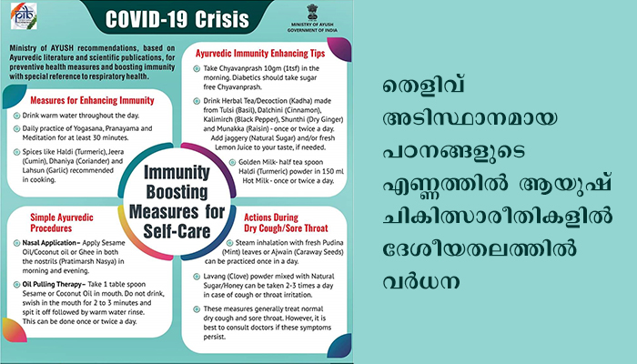 തിരുവനന്തപുരം: തെളിവ് അടിസ്ഥാനമായ പഠനങ്ങളുടെ എണ്ണത്തിൽ ആയുഷ് ചികിത്സാരീതികളിൽ ദേശീയതലത്തിൽ വർധന. 2020 മാർച്ച് 1 മുതൽ 2020 ജൂൺ 25 വരെ ആയുർവേദ വിഭാഗത്തിൽ നിന്നും രജിസ്റ്റർ ചെയ്യപ്പെട്ട പുതിയ ചികിത്സാരീതി കളുടെ എണ്ണം 58 ആണ്.