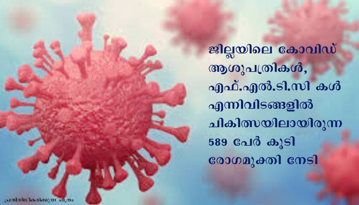 ജില്ലയിലെ കോവിഡ് ആശുപത്രികള്, എഫ്.എല്.ടി.സി കള് എന്നിവിടങ്ങളില് ചികിത്സയിലായിരുന്ന 589 പേര് കൂടി രോഗമുക്തിനേടി ആശുപത്രി വിട്ടു.