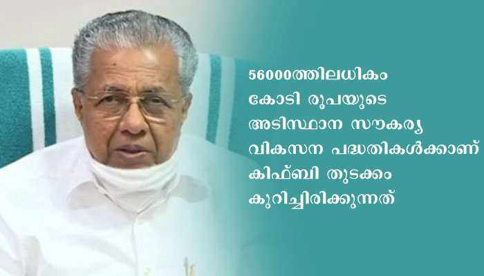56000ത്തിലധികം കോടി രൂപയുടെ അടിസ്ഥാന സൗകര്യ വികസന പദ്ധതികള്ക്കാണ് കിഫ്ബി തുടക്കം കുറിച്ചിരിക്കുന്നത്. ഇതിനു പുറമെ പുതിയ നിര്മിതികള്ക്ക് ബഡ്ജറ്റില് നീക്കി വച്ച തുകയുമുണ്ട്. റീബില്ഡ് കേരള ഇനിഷ്യേറ്റീവിന്റെ ഭാഗമായി 400 കോടി രൂപയുടെ നിര്മാണം ജല അതോറിറ്റിയുടെയും ജലവിഭവ വകുപ്പിന്റേയും നേതൃത്വത്തില് നടക്കുന്നു. ഇതില് 44 പ്രവൃത്തികള് പൂര്ത്തിയായി. 33 പദ്ധതികള് നല്ല രീതിയില് പുരോഗമിക്കുന്നു.