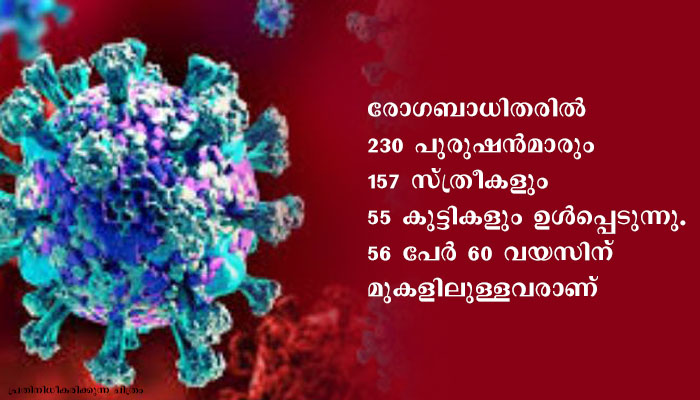 രോഗബാധിതരില് 230 പുരുഷന്മാരും 157 സ്ത്രീകളും 55 കുട്ടികളും ഉള്പ്പെടുന്നു. 56 പേര് 60 വയസിന് മുകളിലുള്ളവരാണ്.