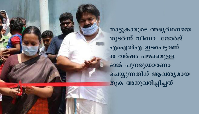 സംസ്ഥാന സര്ക്കാര് 15.25 ലക്ഷം രൂപ അനുവദിച്ചാണ് കുടിവെള്ള പദ്ധതി പൂര്ത്തിയാക്കിയത്. നാട്ടുകാരുടെ അഭ്യര്ഥനയെ തുടര്ന്ന് വീണാ ജോര്ജ് എംഎല്എ ഇടപെട്ടാണ് 30 വര്ഷം പഴക്കമുള്ള ടാങ്ക് പുനരുദ്ധാരണം ചെയ്യുന്നതിന് ആവശ്യമായ ഫണ്ട് അനുവദിപ്പിച്ചത്. 2.5 ലക്ഷം ലിറ്റര് വെള്ളം സംഭരിക്കുന്നതിനുള്ള ശേഷി പുതിയ ടാങ്കിനുണ്ട്. ഇത് പ്രദേശത്തെ 1600 ഓളം കുടുംബങ്ങള്ക്ക് കുടിവെള്ളം എത്തിക്കുന്നതിന് ഉപകരിക്കും.