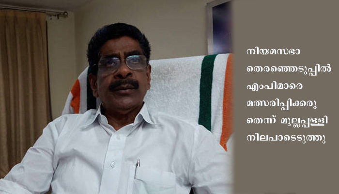 നിയമസഭാ തെരഞ്ഞെടുപ്പില് എംപിമാരെ മത്സരിപ്പിക്കരുതെന്ന് മുല്ലപ്പള്ളി നിലപാടെടുത്തു. മുരളീധരന് ഉള്പ്പെടെയുള്ളവര് മുല്ലപ്പള്ളിക്കെതിരെ പരസ്യ വിമര്ശനം നടത്തിയിരുന്നു