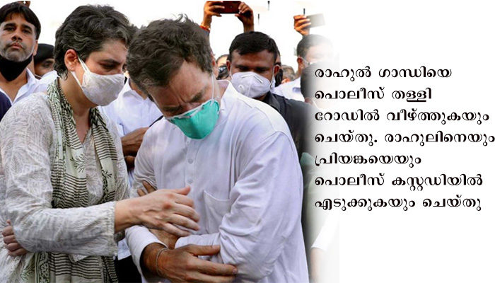 ന്യൂഡൽഹി : ഉത്തർപ്രദേശിലെ ഹത്റാസിൽ ക്രൂരമായി ബലാൽസംഗം ചെയ്ത് കൊല്ലപ്പെട്ട പെൺകുട്ടിയുടെ വീട്ടിലേക്ക് പുറപ്പെട്ട രാഹുൽ ഗാന്ധിയെയും പ്രിയങ്കാ ഗാന്ധിയെയും യമുനാ എക്സ്പ്രസ് ഹൈവേയിൽ പൊലീസ് തടഞ്ഞു. രാഹുൽ ഗാന്ധിയെ പൊലീസ് തള്ളി റോഡിൽ വീഴ്ത്തുകയും ചെയ്തു. രാഹുലിനെയും പ്രിയങ്കയെയും പൊലീസ് കസ്റ്റഡിയിൽ എടുക്കുകയും ചെയ്തു. ഹത്റാസിലെ സംഘർഷ സാഹചര്യവും നിരോധനാജ്ഞയും ചൂണ്ടിക്കാട്ടിയാണ് ഈ നടപടിയെന്നാണ് പൊലീസ് ഭാഷ്യം.